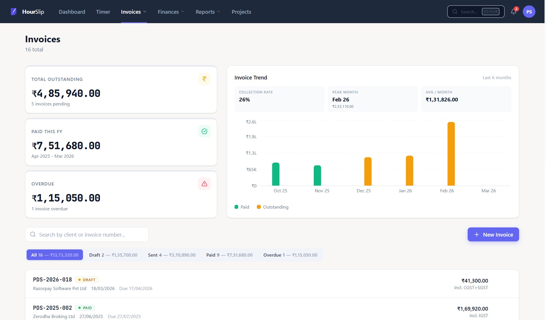 CGST/SGST for intra-state, IGST for inter-state — calculated automatically based on client location. SAC codes, place of supply, everything in the right format.