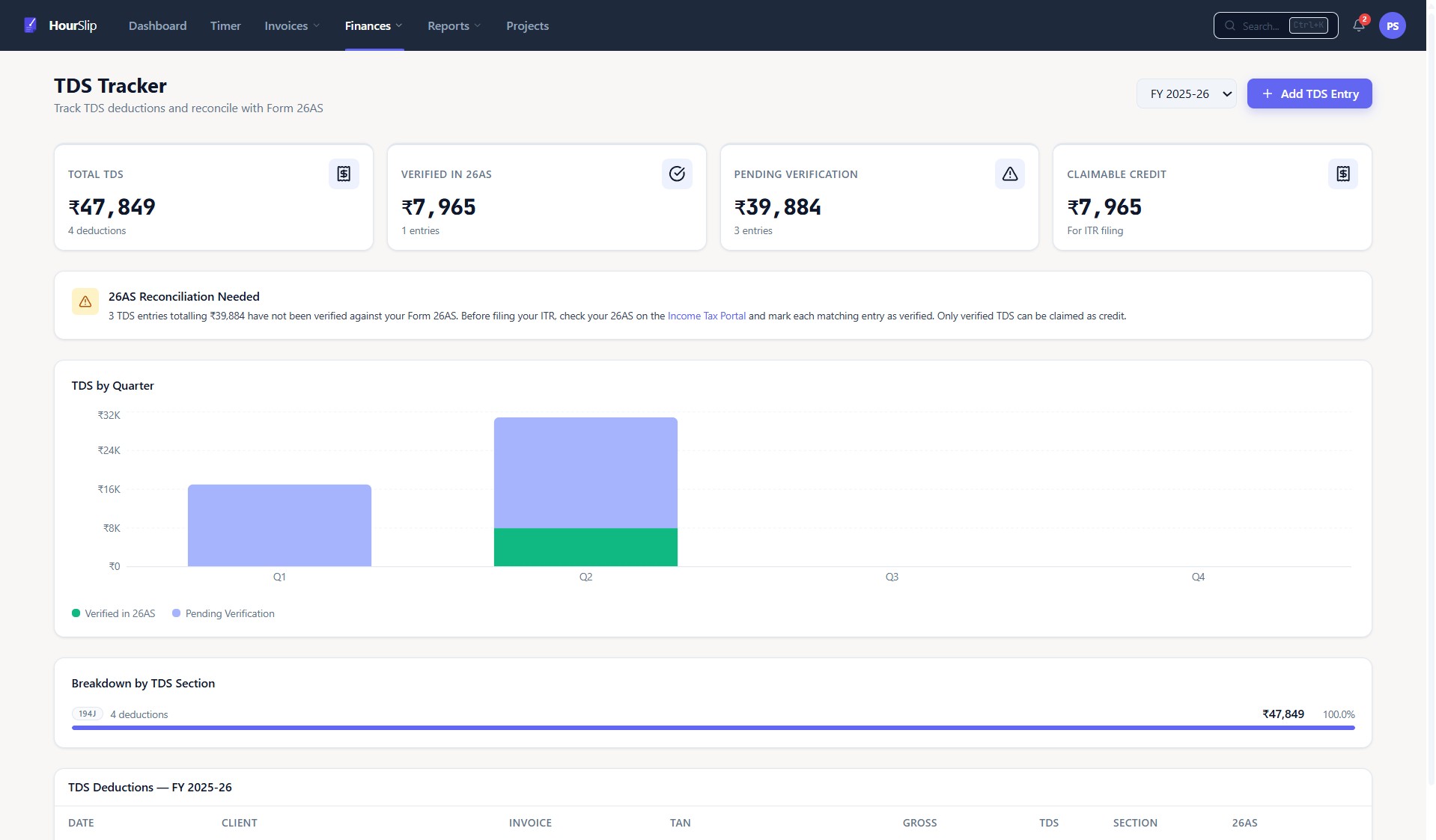 Clients deduct TDS. Know exactly what's claimable this year. HourSlip tracks every deduction and flags entries that haven't been verified against your 26AS.